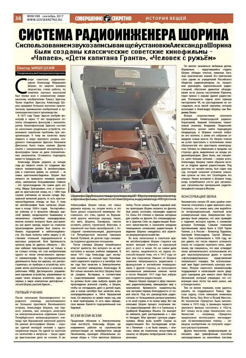Александр Шорин родился за четыре года до первого опыта по созданию звукового кинематографа. В автобиографии, уже в советское время, он написал – «в семье крестьянина-бедняка». Шорин был непрост, он прекрасно понимал правила игры, навязанные большевиками: главное – это происхождение. На самом деле его отец, Фёдор Григорьевич, хоть и происходил из крестьянской семьи, но с 1889 года служил учётчиком на лесном складе Варшавской железной дороги, то есть крестьянином-бедняком отнюдь не был. К тому же автобиография была написана Шориным в конце 1930-х годов. Беспартийному учёному (а в прошлом офицеру царской армии), неоднократно бывавшему в заграничных служебных командировках, многие коллеги которого были расстреляны как враги народа, акцент на «нужном» происхождении должен был помочь избежать подозрений в неблагонадёжности. Это была попытка найти защиту в обстановке тотальной подозрительности и массовых репрессий. Хотя бдительность органов вряд ли удалось обмануть – Шорин избежал преследований не только и не столько потому, что стал изобретателем одного из типов отечественного звукового кинематографа. Его исследовательская деятельность была так широка, что распространялась на приборы и устройства, которыми могли воспользоваться и военные, и работники НКВД. Дистанционно управляемые взрывные устройства, управляемые по радио танки, мощные усилители, один из первых в мире компактных диктофонов – это всё Шорин, русский Эдисон…