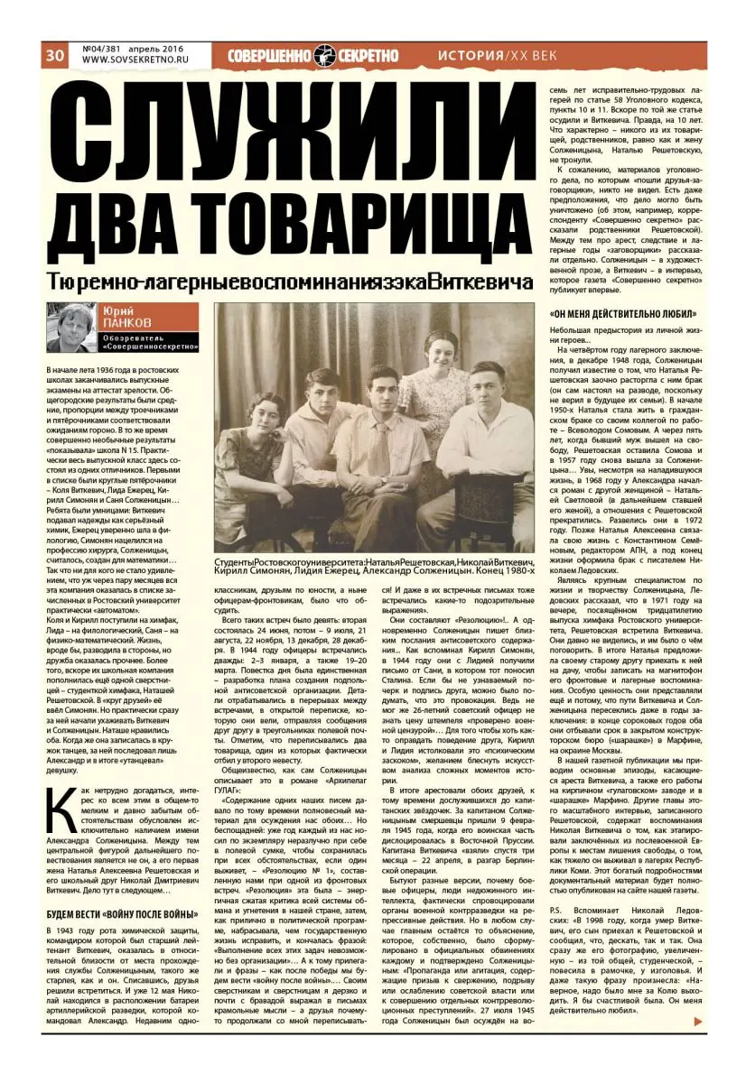 К сожалению, материалов уголовного дела, по которым «пошли друзья-заговорщики», никто не видел. Есть даже предположения, что дело могло быть уничтожено (об этом, например, корреспонденту «Совершенно секретно» рассказали родственники Решетовской). Между тем про арест, следствие и лагерные годы «заговорщики» рассказали отдельно. Солженицын – в художественной прозе, а Виткевич – в интервью, которое газета «Совершенно секретно»