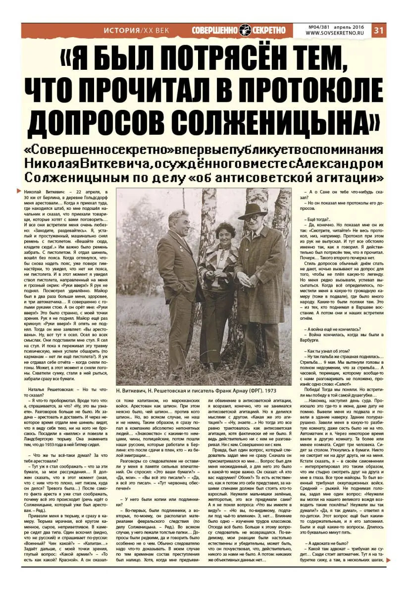 «Совершенно секретно» впервые публикует воспоминания Николая Виткевича, осуждённого вместе с Александром Солженицыным по делу «об антисоветской агитации»
