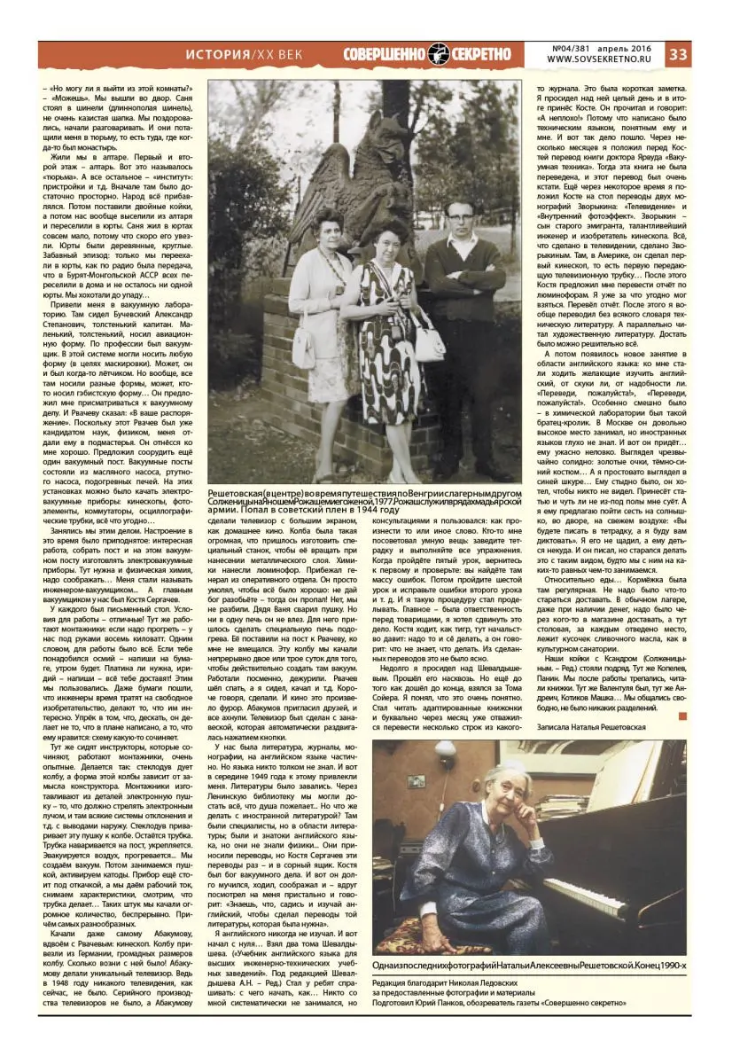 В нашей газетной публикации мы приводим основные эпизоды, касающиеся ареста Виткевича, а также его работы на кирпичном «гулаговском» заводе и в «шарашке» Марфино. Другие главы этого масштабного интервью, записанного Решетовской, содержат воспоминания Николая Виткевича о том, как этапировали заключённых из послевоенной Европы к местам лишения свободы, о том, как тяжело он выживал в лагерях Республики Коми. Этот богатый подробностями документальный материал будет полностью опубликован на сайте нашей газеты.