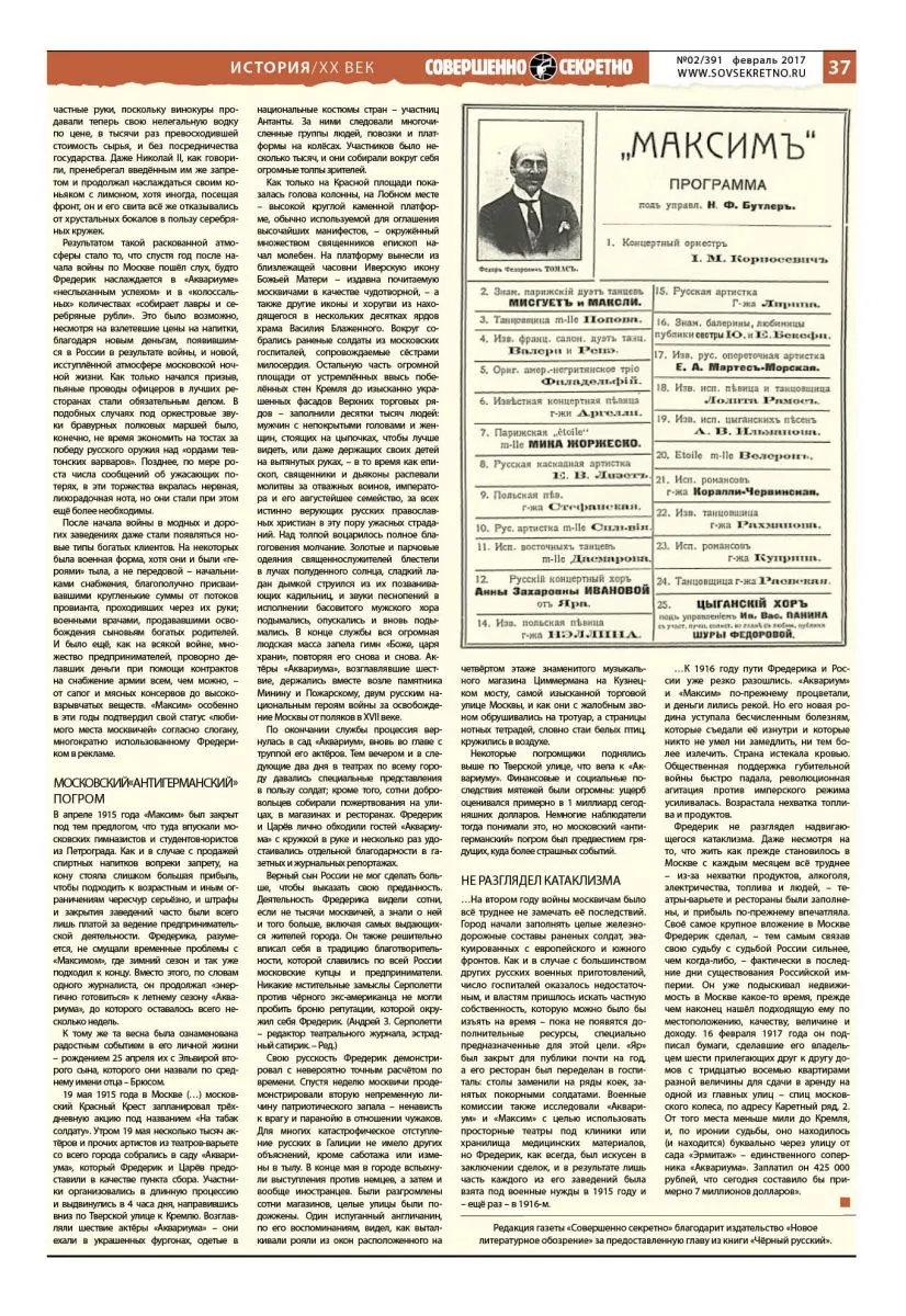…К 1916 году пути Фредерика и России уже резко разошлись. «Аквариум» и «Максим» по-прежнему процветали, и деньги лились рекой. Но его новая родина уступала бесчисленным болезням, которые съедали её изнутри и которые никто не умел ни замедлить, ни тем более излечить. Страна истекала кровью. Общественная поддержка губительной войны быстро падала, революционная агитация против имперского режима усиливалась. Возрастала нехватка топлива и продуктов.
