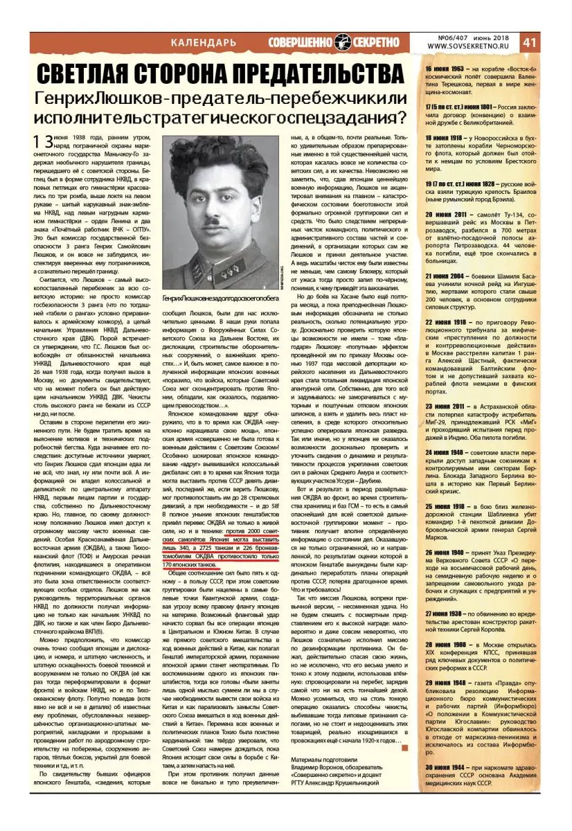 Оставим в стороне перипетии его жизненного пути. Не будем тратить время на выяснение мотивов и технических подробностей бегства. Куда значимее его последствия: доступные источники уверяют, что Генрих Люшков сдал японцам едва ли не всё, что знал, ну или почти всё. А информацией он владел колоссальной и деликатной: по центральному аппарату НКВД, первым лицам партии и государства, собственно по Дальневосточному краю. Но, главное, по своему должностному положению Люшков имел доступ к огромному массиву чисто военных сведений. Особая Краснознамённая Дальневосточная армия (ОКДВА), а также Тихоокеанский флот (ТОФ) и Амурская речная флотилия, находившиеся в оперативном подчинении командующего ОКДВА, – всё это была зона ответственности соответствующих особых отделов. Люшков же как руководитель территориальных органов НКВД по должности получал информацию не только как начальник УНКВД по ДВК, но также и как член Бюро Дальневосточного крайкома ВКП(б).