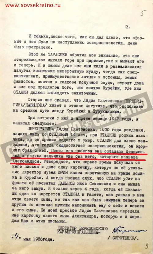 Coming back to Krasnoyarsk, I sent the instructor of the CPSU regional committee comrade Sirotenko to Kureyka and Dudinka concerning that question. Coming back from the trip, comrade Sirotenko reported me, that he found Ivanovs and Pereprygins, and told me that comrde Stalin lived with 14-year-old Lidya Pereprygina and that she has a son from him. At the same time Lidya Pereprygina gave a picture of his son Alexander