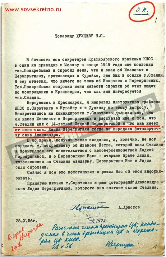 And what is doing here the already mentioned interrogation from the May 1956? Whom Lidya Pereprygina (let us name her surname right) told about Stalin? Were there any witnesses of their relationship? According to whose initiative gendarme Laletin suddenly started to be anxious with moral make-up of the future “leader of nations”? And is that true, that comrade Stalin was never interested about the fortune of his relatives from Kureyka? To all these questions we got the full answers after investigation of materials of fact-finding concerning Stalin and his nonmarital son, which was performed by the Presidium of the CK CPSU and KGB of the USSR in spring 1956.