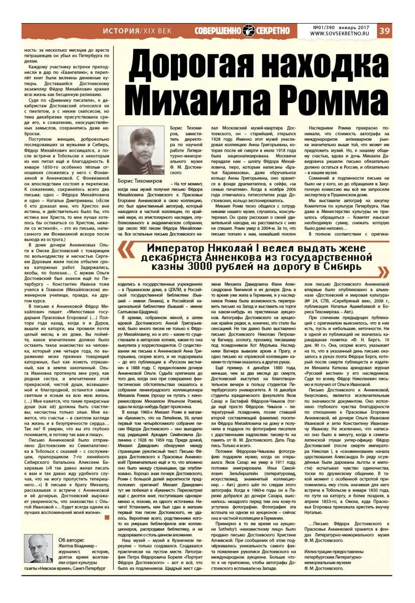 В архиве, собранном женой, а затем вдовой Достоевского Анной Григорьевной, было много писем не только к Фёдору Михайловичу, но и его – какие-то существовали в авторских копиях, какие-то она выкупила у корреспондентов. О существовании же письма к Анненковой Анна Григорьевна, скорее всего, и не подозревала – до его публикации в «Русском вестнике» в 1888 году. С предисловием дочери Анненковой Ольги. Судьба оригинала до того дня, когда оно при совершенно фантастических обстоятельствах оказалось в собрании ленинградского коллекционера Михаила Ромма (прошу не путать с кинорежиссёром Михаилом Ильичом Ромом), едва ли когда-нибудь будет прояснена.