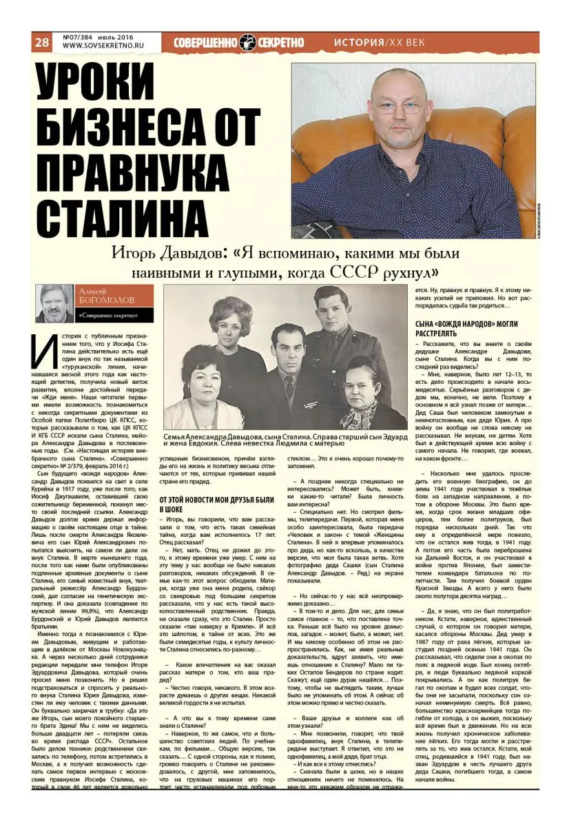 Именно тогда я познакомился с Юрием Давыдовым, живущим и работающим в далёком от Москвы Новокузнецке. А через несколько дней сотрудники редакции передали мне телефон Игоря Эдуардовича Давыдова, который очень просил меня позвонить. Но я решил подстраховаться и спросить у реального внука Сталина Юрия Давыдова, известен ли ему человек с такими данными. Он буквально закричал в трубку: «Да это же Игорь, сын моего покойного старшего брата Эдика! Мы с ним не виделись больше двадцати лет – потеряли связь во время распада СССР». Остальное было делом техники: родственники связались по телефону, потом встретились в Москве, а я получил возможность сделать самое первое интервью с московским правнуком Иосифа Сталина, который в свои 46 лет является довольно успешным бизнесменом, причём взгляды его на жизнь и политику весьма отличаются от тех, которые прививал нашей стране его прадед.