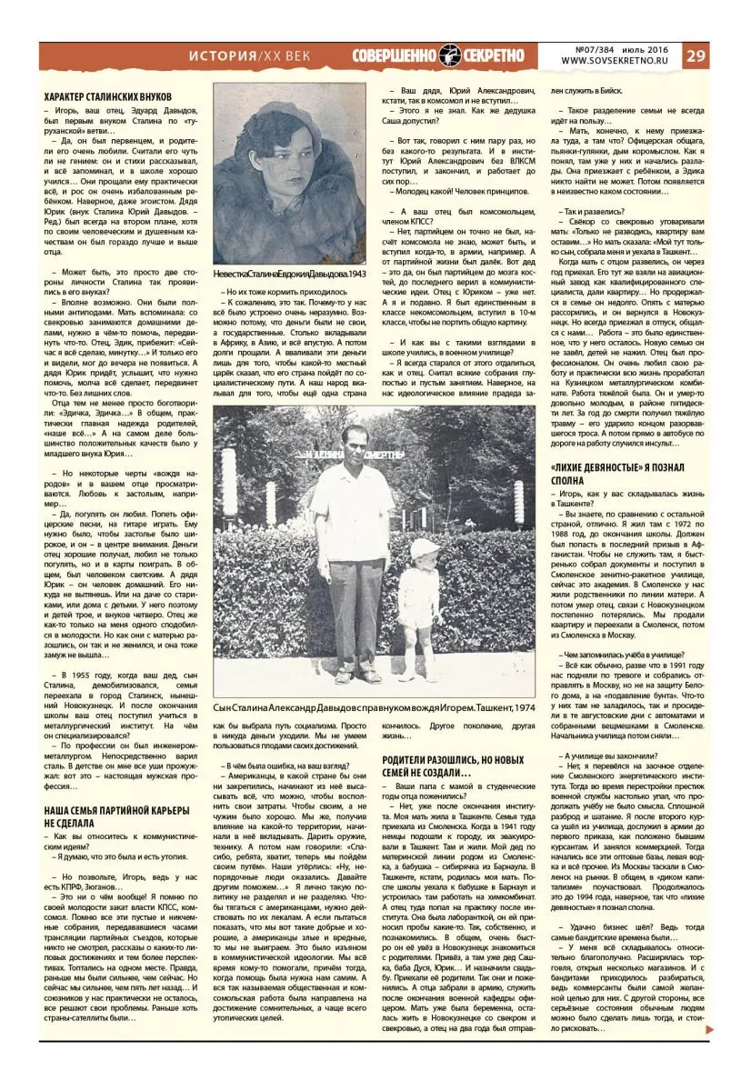 – В том-то и дело. Для нас, для семьи самое главное – то, что поставлена точка. Раньше всё было на уровне домыслов, загадок – может, было, а может, нет. И мы никому особенно об этом не распространялись. Как, не имея реальных доказательств, вдруг заявить, что имеешь отношение к Сталину? Мало ли таких Остапов Бендеров по стране ходит. Скажут, ещё один дурак нашёлся… Поэтому, чтобы не выглядеть таким, лучше было не упоминать об этом. А сейчас об этом можно прямо и честно сказать.