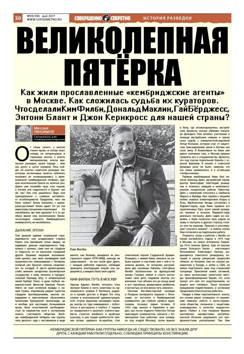 Они дышали идеями социальной справедливости, они штудировали старика Карла, они презирали тупых мещан, не видевших дальше недожаренного бифштекса с кровью, сами они не страдали от бедности, но не выносили страданий других (бушевал мировой экономический кризис), они люто ненавидели своё правительство, заигрывавшее с Гитлером, который уже брызгал слюной, нацеливаясь на соседей. А где-то далеко-далеко слабо маячило загадочное пролетарское государство, к нему тянулись и парадоксальный Бернард Шоу, и литературный гений Герберт Уэллс, и даже глубоко немарксистский философ Бертран Рассел. Никто не знал истинной правды о нашей стране, откровения редких туристов страдали противоречиями, многие передержки и преступления объяснялись происками буржуазной пропаганды, да и вообще для настоящих большевиков кровь была естественной необходимостью на каменистом пути к построению нового, счастливого общества. Вообще «кембриджской пятёрки» как группы типа детского сада с наставником в виде умного, как Вольтер, резидента из иностранного отдела ОГПУ-НКВД, никогда не существовало – не все знали друг друга, с каждым работали отдельно, соблюдая принципы конспирации (порой они нарушались), у каждого была своя судьба.