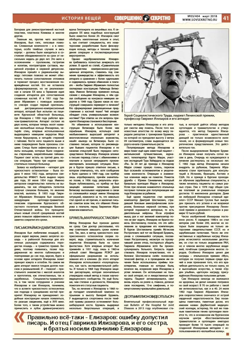 Влиятельный профессиональный журнал BulletinoftheHospitalforJointDiseases в 2013 году опубликовал статью, в которой даётся обзор методов ортопедии и травматологии и утверждается, что метод Гавриила Илизарова – практически единственный дающий не только возможности излечения, но и формирующий новые теоретические представления. Это действительно так.