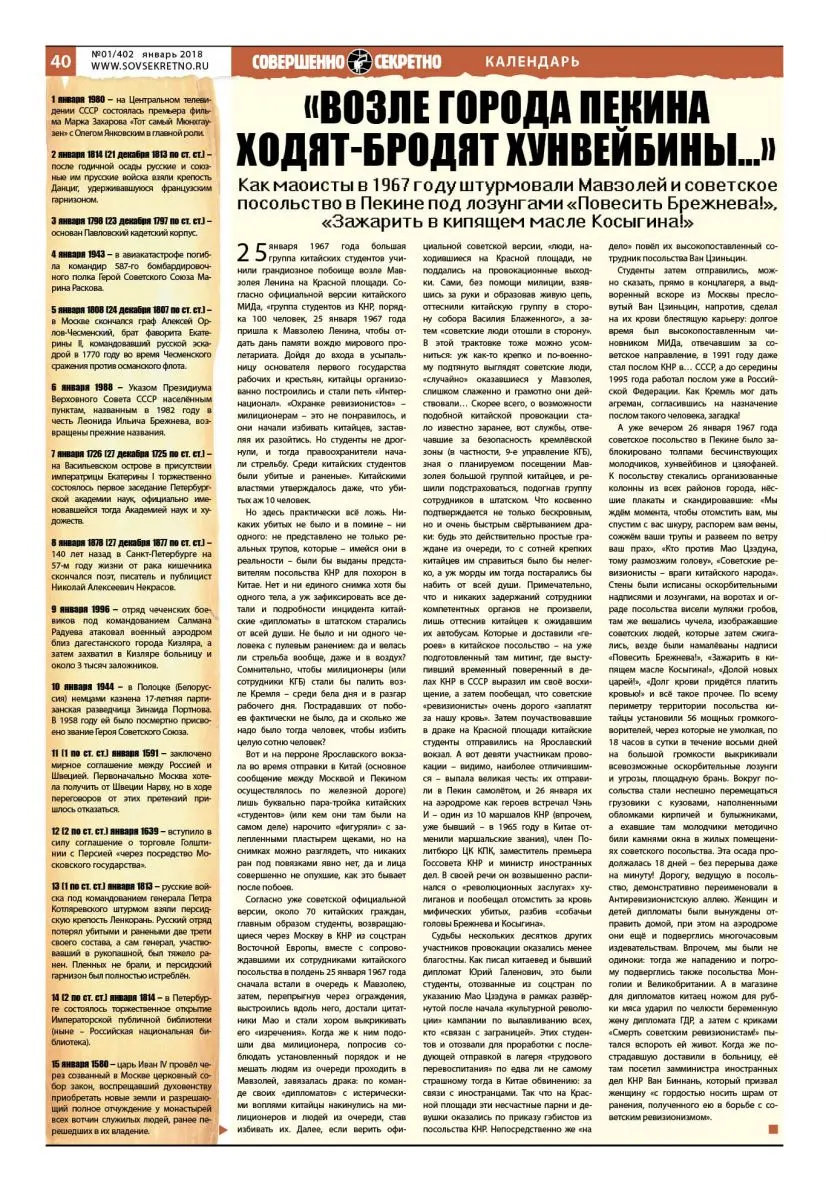 25 января 1967 года большая группа китайских студентов учинили грандиозное побоище возле Мавзолея Ленина на Красной площади. Согласно официальной версии китайского МИДа, «группа студентов из КНР, порядка 100 человек, 25 января 1967 года пришла к Мавзолею Ленина, чтобы отдать дань памяти вождю мирового пролетариата. Дойдя до входа в усыпальницу основателя первого государства рабочих и крестьян, китайцы организованно построились и стали петь «Интернационал». «Охранке ревизионистов» – милиционерам – это не понравилось, и они начали избивать китайцев, заставляя их разойтись. Но студенты не дрогнули, и тогда правоохранители начали стрельбу. Среди китайских студентов были убитые и раненые». Китайскими властями утверждалось даже, что убитых аж 10 человек.