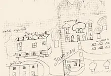 | План Бадабера, сделанный Носиржоном Рустамовым по просьбе автора статьи. Местные называли этот лагерь «Зангали». Масжид – мечеть, зобит – охрана, ошхона – кухня | |