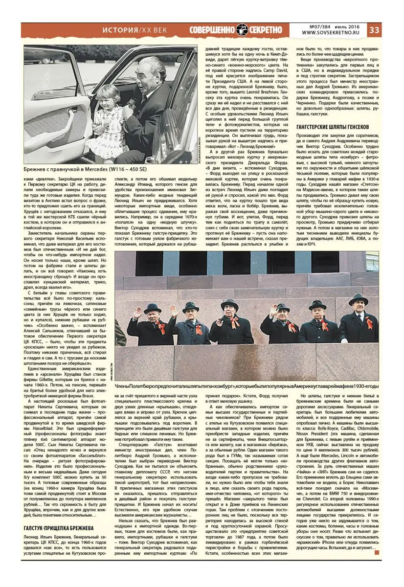 Но шляпы, галстуки и нижнее бельё в брежневские времена были не самыми дорогими аксессуарами. Генеральный секретарь был большим любителем автомобилей, и все подаренные ему машины опробовал лично. А машины были высшего класса: Rolls-Royce, Cadillac, Oldsmobile, Nissan President (эта машина, сделанная для Брежнева, с левым рулём и приёмником УКВ, сейчас выставлена на продажу по цене 9 миллионов 300 тысяч рублей). А ещё были Mercedes, Lincoln и автомобили производства других флагманов автостроения. За руль отечественных машин «Чайка» и «ЗИЛ» Брежнев сам не садился. Его преемники вплоть до Ельцина сами автомобили не водили, а Борис Николаевич всё-таки поездил сначала на «Москвиче», а потом на BMW 750 и внедорожнике Chevrolet. Со второй половины 1990-х регулярное использование отечественных автомобилей высшими должностными лицами государства прекратилось. И сегодня уже никто не задумывается о том, какие костюмы, ботинки, часы и головные уборы они носят. Разве что вспыхнет дискуссия о том, правильно ли использовать «вражеский» iPhone или откуда появились дорогущие часы. Вспыхнет, да и затухнет…
