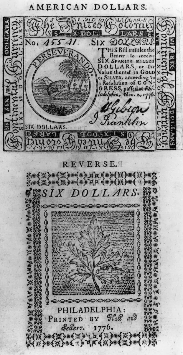 Денег катастрофически не хватало. Одной из главных проблем, с которыми столкнулись американские повстанцы, был поиск средств для финансирования Войны за независимость. Франклин и другие отцы-основатели Америки решили не изобретать велосипеда и остановили свой выбор на бумажных деньгах. Первые ассигнации на сумму 40 тысяч фунтов стерлингов были выпущены в Массачусетсе в 1690 году и пошли на оплату военной экспедиции в тогда еще французский Квебек.