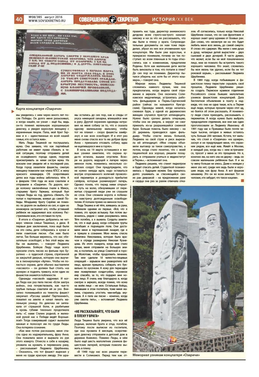 В итоге в «Озаричи» добрались не четверо членов семьи Тишиных, а двое. В первые дни заключения, пока ещё были на это силы, дети собирались в кучки и пели советские песни. «Так нам было легче. Так больше верилось, что нас обязательно освободят, а без этой веры мы бы не выжили», – говорит Людмила Щербенева. Бойкую Люду чаще всего просили спеть песню из фильма про Буратино – о чудесной стране, спрятанной за закрытой дверью, которую она выучила в пионерлагере «Артек». Чтобы не попасться охране, дети обычно выставляли «часового» – он должен был стоять «на шухере» и поднять тревогу, если один из фашистов окажется поблизости.