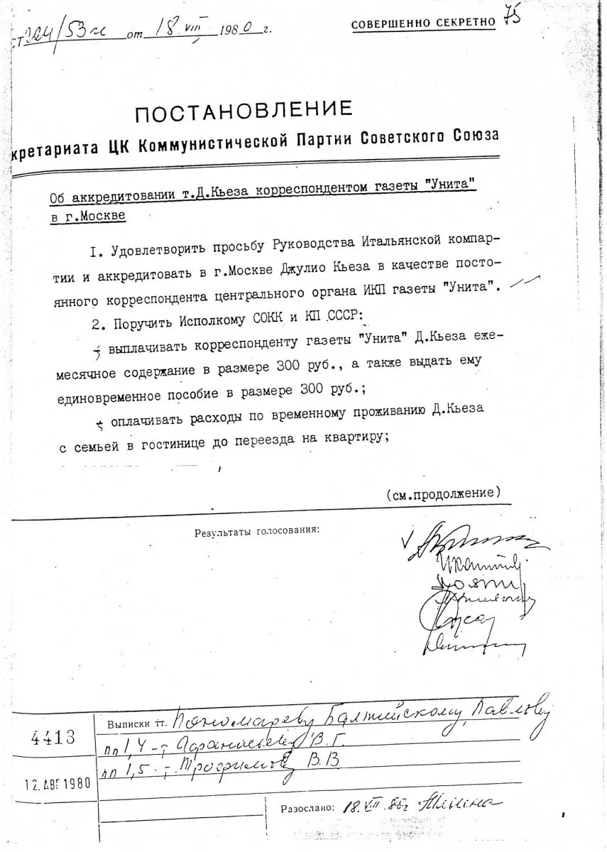 В архивах бывшего ЦК КПСС нередко можно обнаружить интереснейшие документы, не утратившие своей актуальности и поныне. Например, постановление Секретариата ЦК КПСС, значащееся за № Ст-224/53гс от 18 августа 1980 года на бланке с грифом «Совершенно секретно»: «Об аккредитовании т. Д. Кьеза корреспондентом газеты «Унита» в г. Москве». Еще на красивом бланке с логотипом «Коммунистическая Партия Советского Союза. Центральный комитет» по левому краю мелким шрифтом вертикально пропечатано: «Подлежит возврату в ЦК КПСС (Общий отдел, 11-й сектор) через 15 дней со дня получения (Пост. Секретариата ЦК КПСС от 17 июня 1976 г., пр. № 12, п.4с)». Эти документы увидели свет в процессе подготовки суда над КПСС – в числе материалов о незаконной финансовой деятельности КПСС, в частности, о финансировании иностранных компартий.