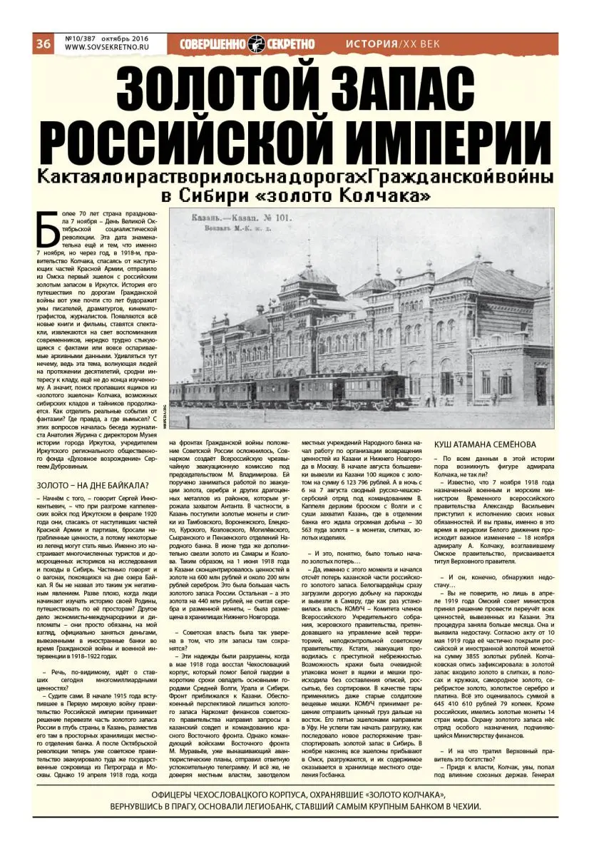 – Начнём с того, – говорит Сергей Иннокентьевич, – что при разгроме каппелевских войск под Иркутском в феврале 1920 года они, спасаясь от наступивших частей Красной Армии и партизан, бросали награбленные ценности, а потому некоторые из легенд могут стать явью. Именно это настраивает многочисленных туристов и доморощенных историков на исследования и походы в Сибирь. Частенько говорят и о вагонах, покоящихся на дне озера Байкал. Я бы не назвал это таким уж негативным явлением. Разве плохо, когда люди начинают изучать историю своей Родины, путешествовать по её просторам? Другое дело экономисты-международники и дипломаты – они просто обязаны, на мой взгляд, официально заняться деньгами, вывезенными в иностранные банки во время Гражданской войны и военной интервенции в 1918–1922 годах.