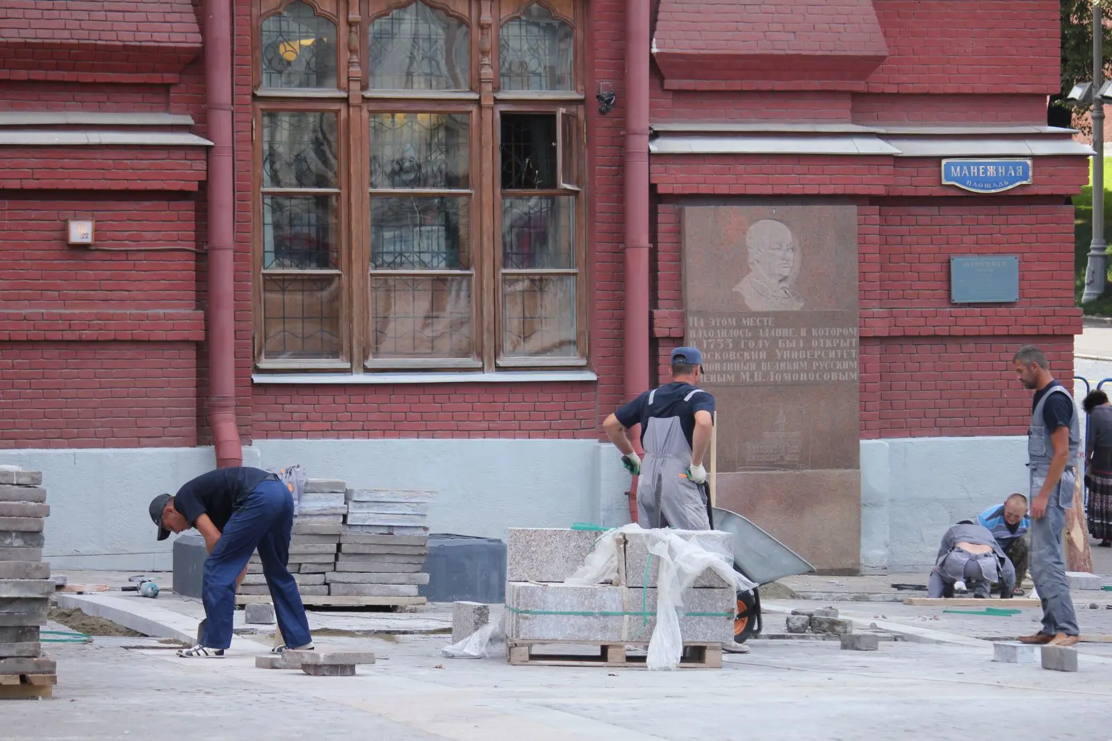Утром 18 июля была перегорожена значительная часть Манежной площади. На этом месте рабочие начали перекладывать плитку.