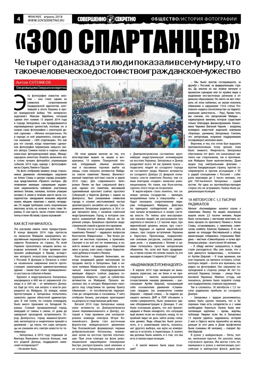 Эта фотография известна многим – она стала одним из символов сопротивления бандеровской идеологии, затопившей в итоге Украину в крови гражданской войны. Что интересно: журналист Максим Щербина, который сделал этот снимок 13 апреля 2014 года в городе Запорожье, сам придерживается евромайданных ценностей, поэтому он и назвал свою фотографию с некоторой долей сарказма – «Яичное воскресенье». Но в народе за ней закрепилось совсем другое название – «З00 спартанцев». Это как раз тот случай, когда талантливо сделанная фотография переиграла замысел своего автора. Снимок попал в «чарты» самых известных фоторепортажей мира. Международное агентство Anadolu включило его в сотню лучших фоторабот, отражающих события 2014 года, наряду с фотографиями из Сирии, Ливии и Турции.
