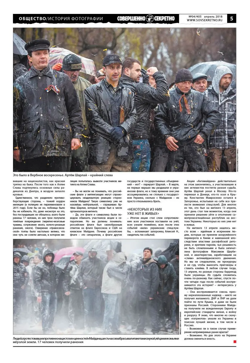 – В апреле 2014 года милиция не выказывала агрессии, нас не били и не преследовали – многие правоохранители сочувствовали нашему движению, – рассказывает Артём Шарлай, называющий себя основателем движения «Славянская гвардия» (на знаменитом снимке Шарлай – первый слева), – За неделю до нашего митинга ДНР и ЛНР объявили о своём суверенитете, было захвачено здание обладминистрации в Донецке. У нас были основания думать, что всё произошедшее в Киеве ненадолго, что ситуацию ещё можно если не отыграть назад, то по крайней мере не дать зайти всему слишком далеко. Ведь общество было расколото, и у захвативших власть, казалось, нет другого выбора, как идти на компромиссы и вступать в переговоры. А значит, мы должны были заявить и о том, что мы есть и такова наша позиция.