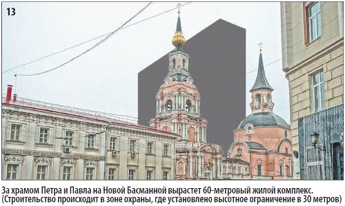 Стройка ведётся в 100 метрах от выдающегося памятника архитектуры федерального значения – храма Петра и Павла на Новой Басманной, построенного по рисунку императора Петра Великого. Последствия для силуэта и облика заповедной улицы, смоделированные дизайнерами «Архнадзора» на основе общедоступных материалов проекта, просто чудовищны. Над стильным барочным храмом вырастет 60-метровый «каменный гость». Не званый никем, кроме городских властей, санкционировавших это строительство. Строительство происходит, как отмечали в «Архнадзоре», в зоне охраны, где установлено высотное ограничение в 30 метров. Установлено теми же городскими властями, но сами себе они не указ.