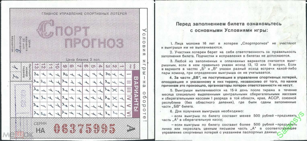 С февраля 1987 года появился и первый советский тотализатор, так называемый «Спортпрогноз» – знатоки, следившие за футбольным чемпионатом, могли ставить на исход спортивных событий. Игравшему предлагались 13 матчей, в основном футбольных, но бывало и других чемпионатов, в которых требовалось угадать исход каждого. Выигрыш в размере половины от суммы купленных билетов в определённой пропорции делился между всеми игроками, угадавшими от 11 результатов и выше.