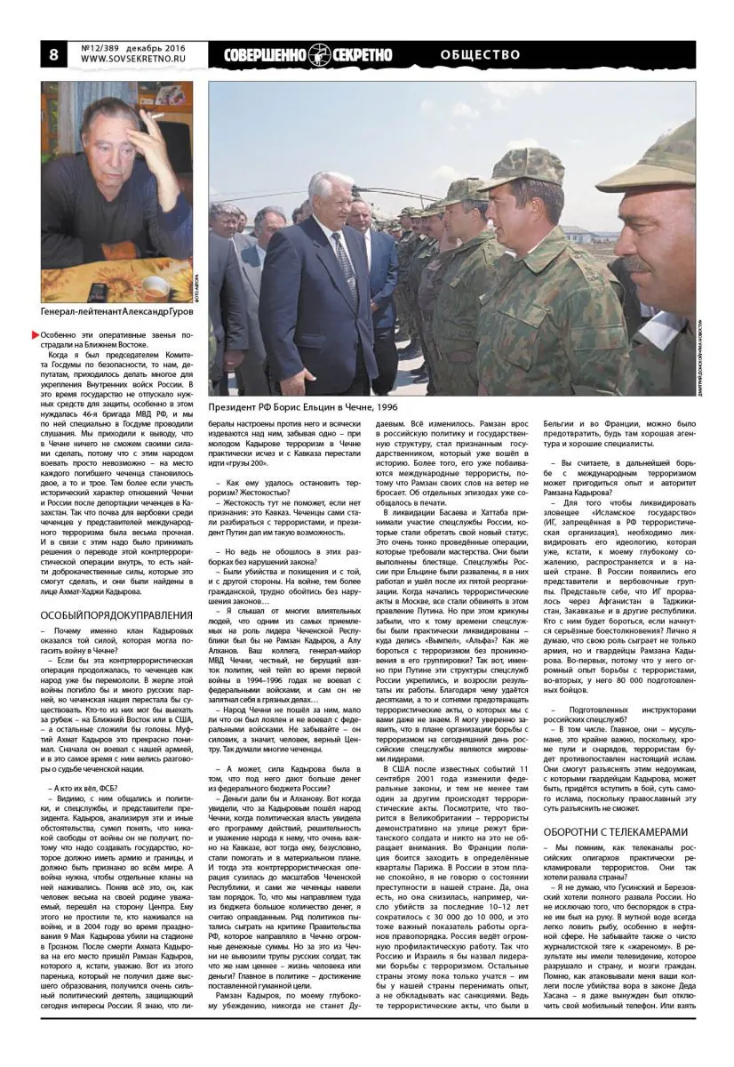 Когда я был председателем Комитета Госдумы по безопасности, то нам, депутатам, приходилось делать многое для укрепления Внутренних войск России. В это время государство не отпускало нужных средств для защиты, особенно в этом нуждалась 46-я бригада МВД РФ, и мы по ней специально в Госдуме проводили слушания. Мы приходили к выводу, что в Чечне ничего не сможем своими силами сделать, потому что с этим народом воевать просто невозможно – на место каждого погибшего чеченца становилось двое, а то и трое. Тем более если учесть исторический характер отношений Чечни и России после депортации чеченцев в Казахстан. Так что почва для вербовки среди чеченцев у представителей международного терроризма была весьма прочная. И в связи с этим надо было принимать решения о переводе этой контртеррористической операции внутрь, то есть найти доброкачественные силы, которые это смогут сделать, и они были найдены в лице Ахмат-Хаджи Кадырова