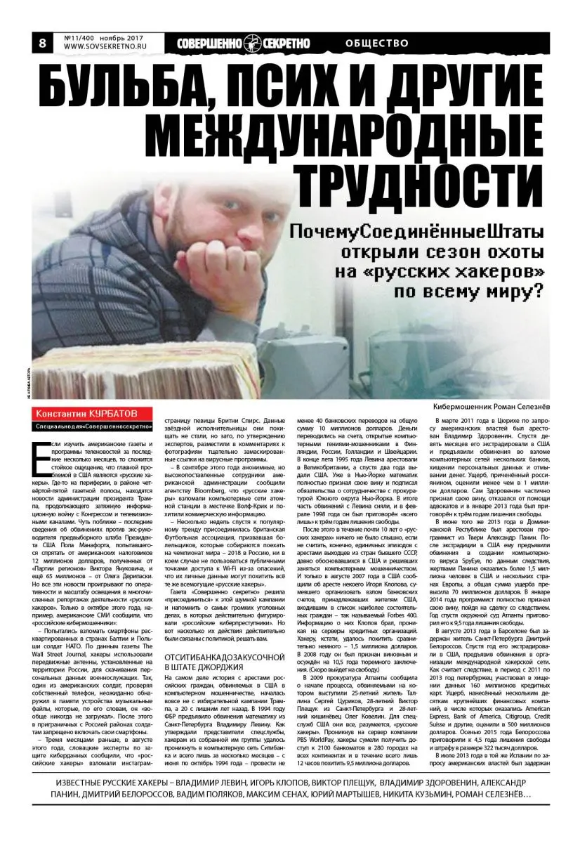 Если изучить американские газеты и программы теленовостей за последние несколько месяцев, то сложится стойкое ощущение, что главной проблемой в США являются «русские хакеры». Где-то на периферии, в районе четвёртой-пятой газетной полосы, находятся новости администрации президента Трампа, продолжающего затяжную информационную войну с Конгрессом и телевизионными каналами. Чуть поближе – последние сведения об обвинениях против экс-руководителя предвыборного штаба Президента США Пола Манафорта, попытавшегося спрятать от американских налоговиков 12 миллионов долларов, полученных от «Партии регионов» Виктора Януковича, и ещё 65 миллионов – от Олега Дерипаски. Но все эти новости проигрывают по оперативности и масштабу освещения в многочисленных репортажах деятельности «русских хакеров». Только в октябре этого года, например, американские СМИ сообщили, что «российские кибермошенники»: