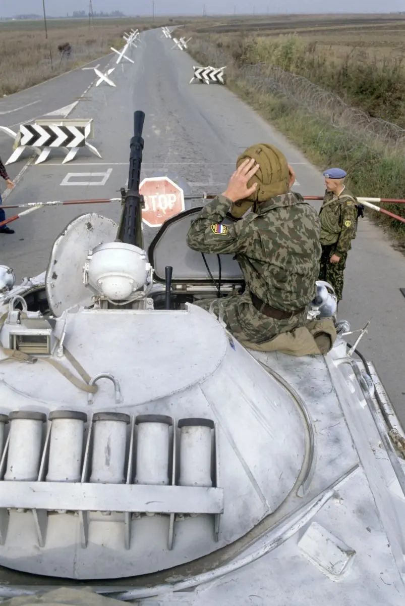 Наша школа по периметру увита колючей проволокой и «путанкой», висящей по столбам. Солдатики на колючку навесили пустых консервных банок. Колючка дергается – банки звенят. С внутренней части периметра – брустверы и окопы. Из окопов тут целая система, как в муравейнике. Можно шляться вокруг школы, не выходя на поверхность. В окопах – огневые точки, ДОТы, «карманы» для раненых и трупов. Въезд на территорию через блокпост, окопные укрепления, две БМП «лицом» к шлагбауму – здоровому бревну с противовесом из камней.