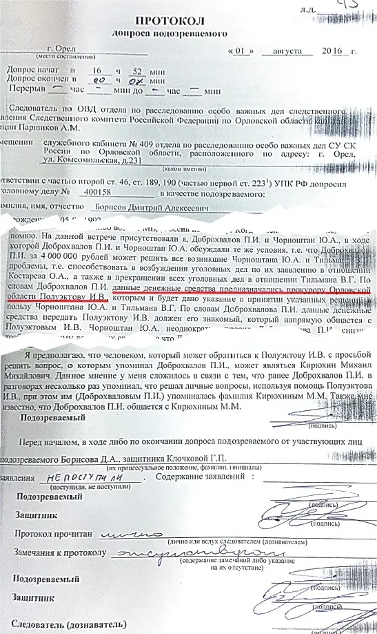 Любопытно, что данный протокол допроса по какой-то причине не рассматривался в судебном заседании. Говорят, что прокурора Орловской области Полуэктова вызывали в Москву и допрашивали по данному делу. Результаты нам неизвестны. Но полученные нами документы заслуживают, на наш взгляд, самого пристального внимания Генпрокуратуры и Следственного комитета России. Можно предполагать, что подозреваемый Борисов, став обвиняемым, мог отказаться от своих показаний, можно рассматривать иные версии того, почему связь Доброхвалов – Кирюхин – Полуэктов не отследили до конца, но, по нашему мнению, к столь важным свидетельствам о покушении на совершение преступлений коррупционной направленности нужно и относиться крайне серьёзно, невзирая на чины и должности.