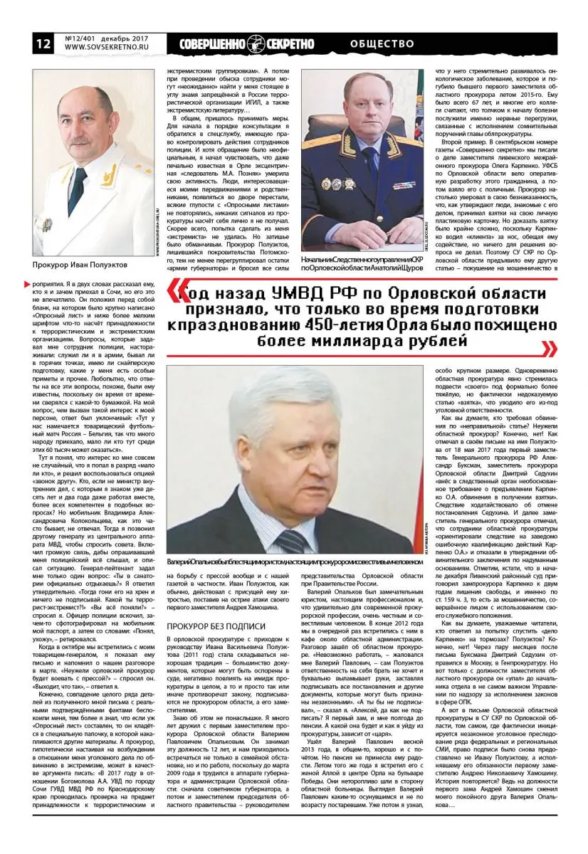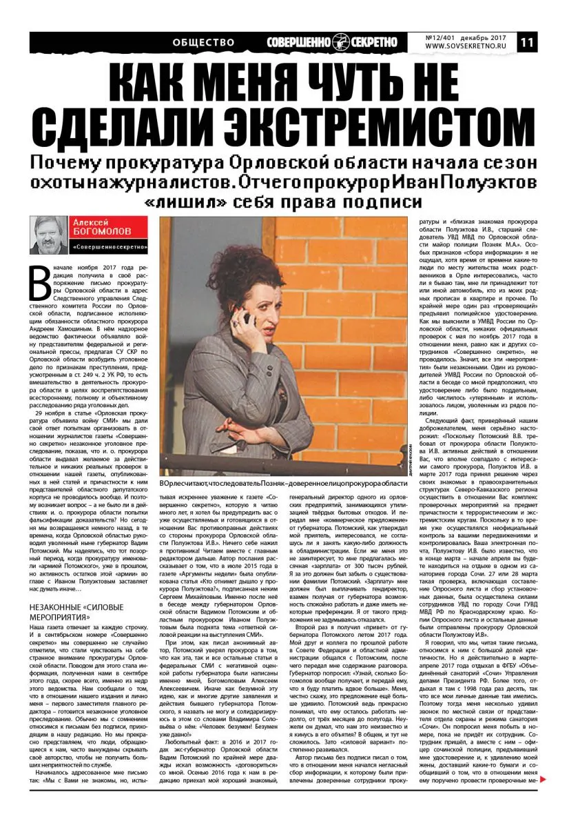 Начиналось адресованное мне письмо так: «Мы с Вами не знакомы, но, испытывая искреннее уважение к газете «Совершенно секретно», которую я читаю много лет, я хотел бы предупредить вас о уже осуществляемых и готовящихся в отношении Вас противоправных действиях со стороны прокурора Орловской области Полуэктова И.В.». Ничего себе нажил я противника! Читаем вместе с главным редактором дальше. Автор послания рассказывает о том, что в июле 2015 года в газете «Аргументы недели» была опубликована статья «Кто отнимет дышло у прокурора Полуэктова?», подписанная неким Сергеем Михайловым. Именно после неё в беседе между губернатором Орловской области Вадимом Потомским и областным прокурором Иваном Полуэктовым была поднята тема «ответной силовой реакции на выступления СМИ».