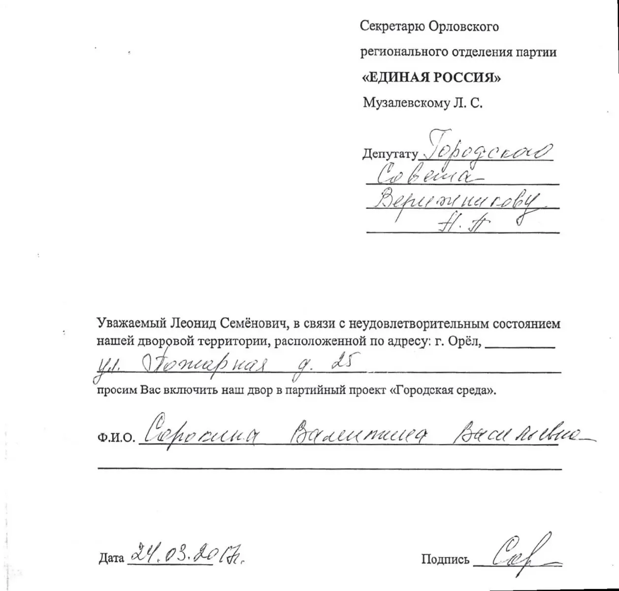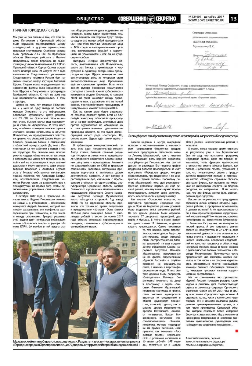 Как писали «Орловские новости», на партийную программу «Городская среда» в Орле из бюджетов разных уровней было выделено 164,3 миллиона рублей. На эти деньги должны были отремонтировать 77 дворовых территорий, два парка и бульвар. В итоге к осени вовремя сдали только 11 объектов, а деньги куда-то «рассосались». Самое пикантное то, что весной, когда определялось, какие дворы будут ремонтировать, среди жителей стали распространяться бланки заявлений на имя председателя областного Совета народных депутатов Леонида Музалевского, напечатанные не по форме, определённой «Единой Россией» и опубликованной на официальном сайте, а именно в персонифицированном виде. В них жители должны были попросить «благодетеля» Леонида Семёновича включить их двор в программу и ждать «счастья». Фамилия Музалевский постоянно светилась в прессе, глава местных единороссов выступал по телевидению, в общем, «руководил процессом», который, однако, как и многие другие мероприятия времён Потомского, оказался негативным. Вокруг Музалевского, регулярно «инспектировавшего» объекты, появились мутные подрядчики из других регионов, «как правило, как отмечала «Российская газета», небольшие ООО с уставным капиталом в 10 тысяч рублей». («РГ неделя», №249/7415 от 2 ноября 2017.) Делали некачественный ремонт и исчезали.