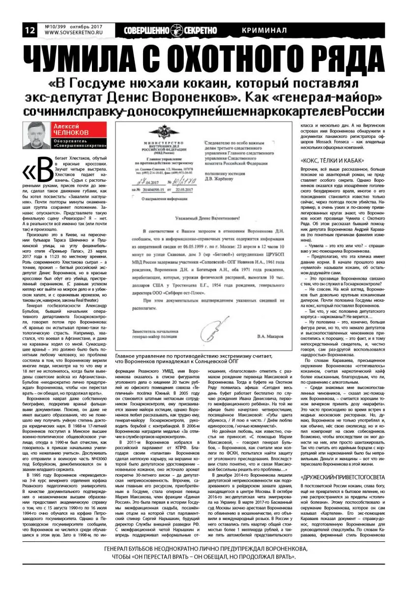 «В Госдуме нюхали кокаин, который поставлял экс-депутат Денис Вороненков». Как «генерал-майор» сочинил справку-донос о крупнейшем наркокартеле в России