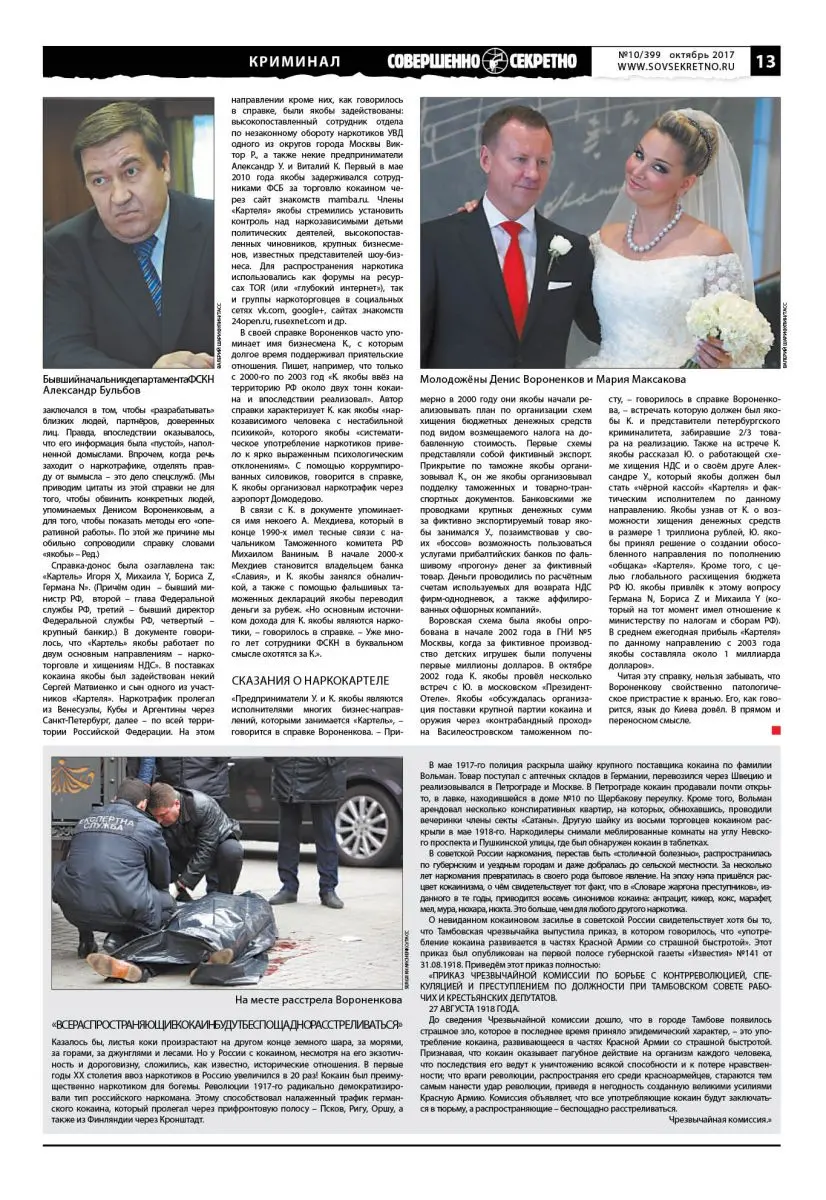 В постсоветской России кокаин, слава богу, ещё не превратился в бытовое явление, но уже распространился за пределы «столичной болезни». Этому поспособствовало и окружение Вороненкова, которое он сам называл «Картелем». Его экс-помощник Караваев показал документ – справку-донос, подготовленную Вороненковым для руководителей спецслужбы. По словам Караваева, фирменный стиль Вороненкова заключался в том, чтобы «разрабатывать» близких людей, партнёров, доверенных лиц. Правда, впоследствии оказывалось, что его информация была «пустой», наполненной домыслами. Впрочем, когда речь заходит о наркотрафике, отделять правду от вымысла – это дело спецслужб. (Мы приводим цитаты из этой справки не для того, чтобы обвинить конкретных людей, упоминаемых Денисом Вороненковым, а для того, чтобы показать методы его «оперативной работы». По этой же причине мы обильно сопроводили справку словами «якобы» – Ред.)