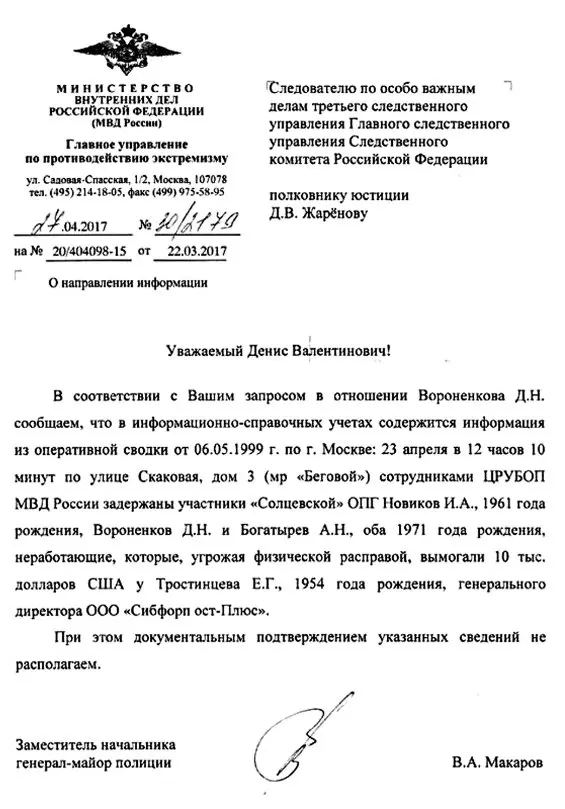 Главное управление по противодействию экстремизму считает, что Вороненков принадлежал к Солнцевской ОПГ