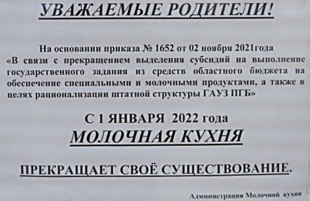 «Пришла бухгалтерия. Сказала, что лимит на 2022 год нам не дали, поэтому молочная кухня ликвидируется, – рассказывает заведующая производством прокопьевской молочной кухни Ольга Шваб. – Мы предупредили родителей, везде объявления развешали. Родители в шоке. Они писали губернатору Кузбасса Цивилёву, писали Мишустину, собирали подписи. Мы сейчас подчиняемся Прокопьевской горбольнице, которую возглавляет Ирина Вереинова. Она подписала приказ о ликвидации молочной кухни в городе и сокращении штатов. Родители писали ей заявления, но она сейчас на больничном. Насколько мне известно, ни от кого никакой реакции на обращения не было».