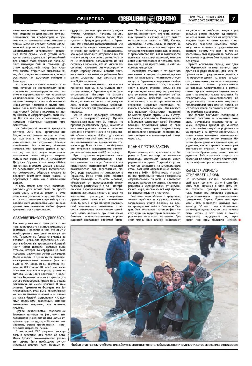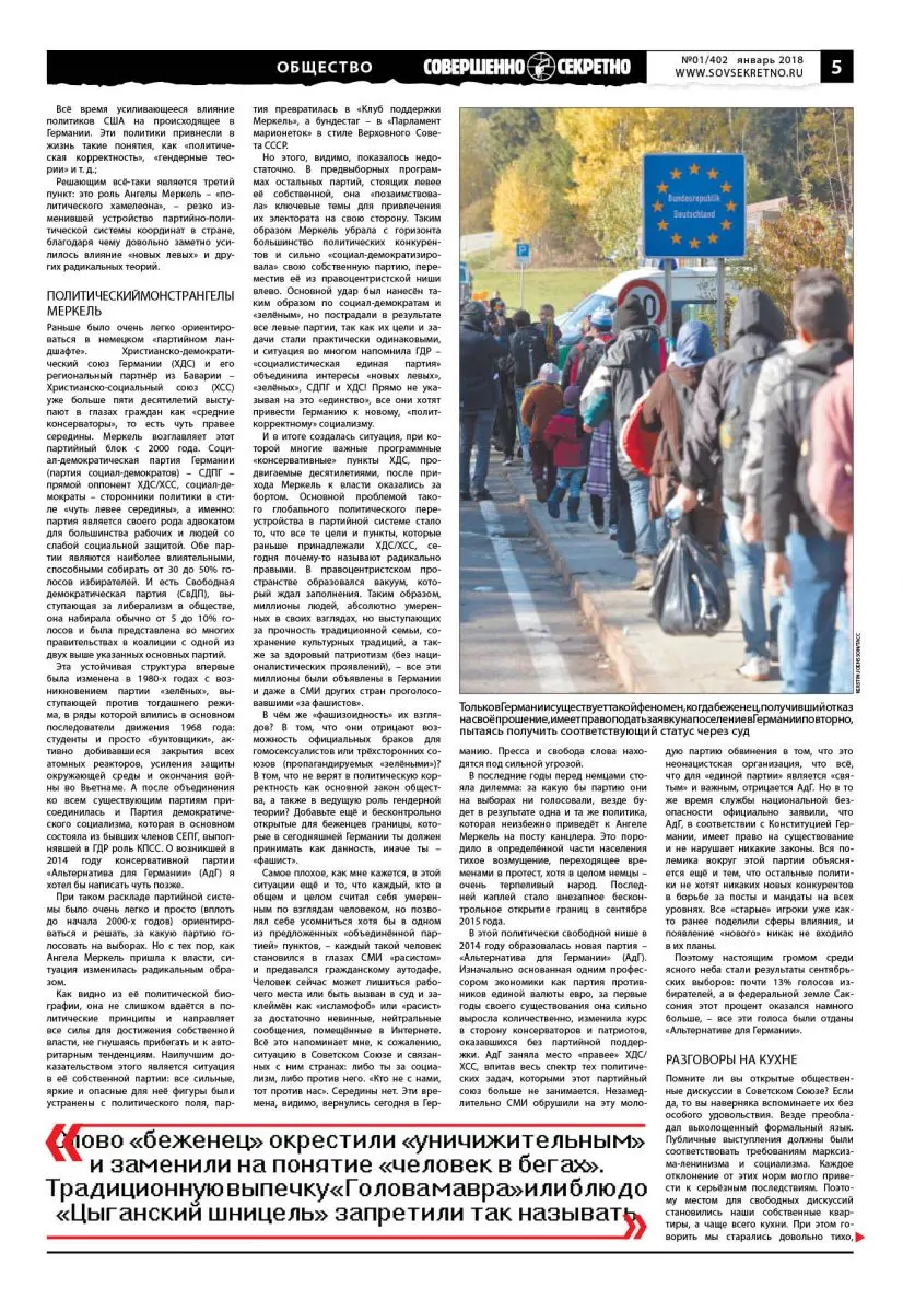 С 2015 года тема беженцев практически разделила Германию на два лагеря и фактически привела к наиболее низкому проценту на выборах для партии Меркель. Подавляющее большинство немцев не являются ксенофобами и не выступают принципиально против цивилизованной эмиграции. В то же время полная беспомощность государства в 2015 – 2016 годах, когда потеря контроля совмещалась с некомпетентностью, прикрывавшейся представителями политических элит лозунгами все той же «политкорректности», вызвала недовольство граждан.