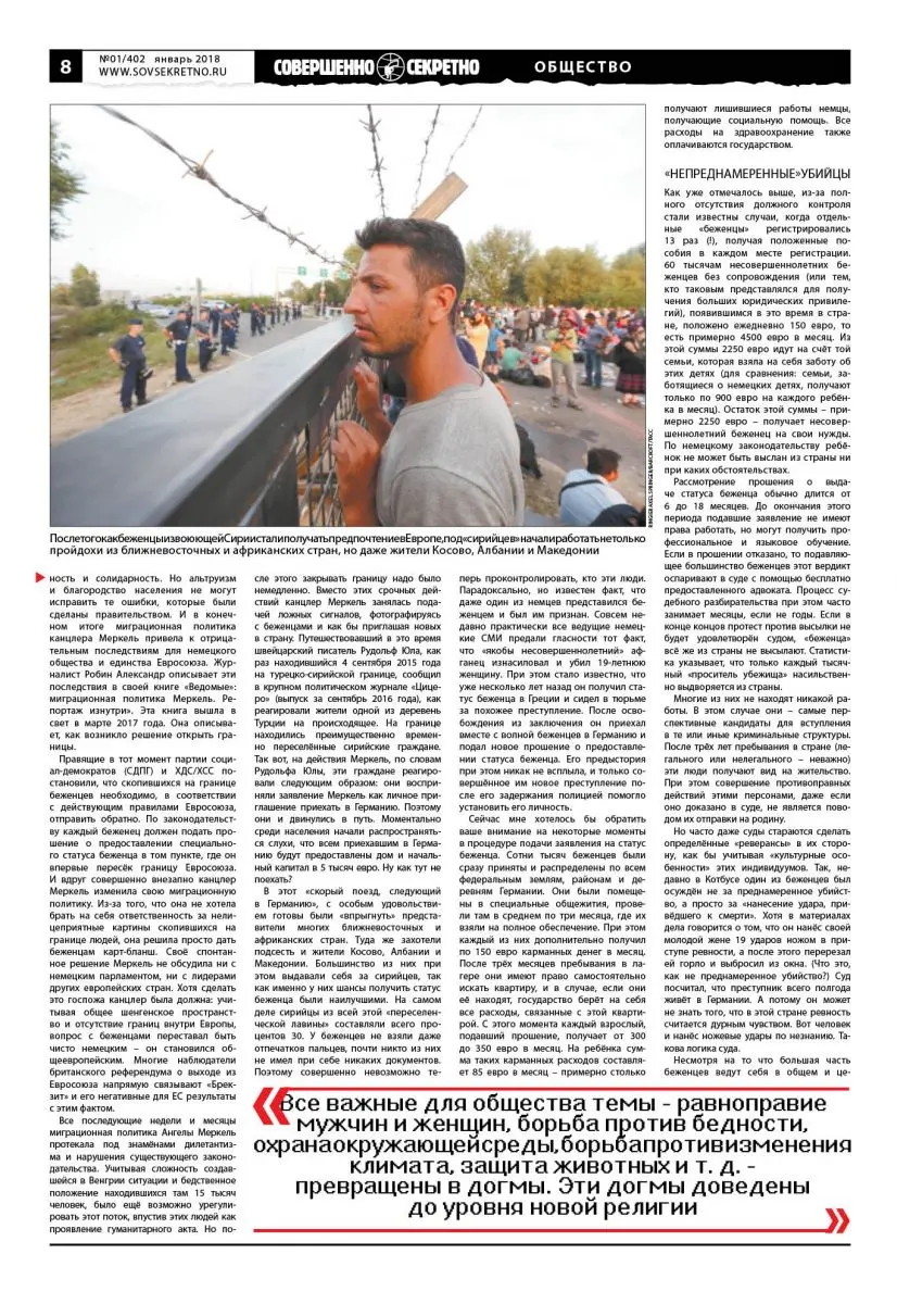 В этот «скорый поезд, следующий в Германию», с особым удовольствием готовы были «впрыгнуть» представители многих ближневосточных и африканских стран. Туда же захотели подсесть и жители Косово, Албании и Македонии. Большинство из них при этом выдавали себя за сирийцев, так как именно у них шансы получить статус беженца были наилучшими. На самом деле сирийцы из всей этой «переселенческой лавины» составляли всего процентов 30. У беженцев не взяли даже отпечатков пальцев, почти никто из них не имел при себе никаких документов. Поэтому совершенно невозможно теперь проконтролировать, кто эти люди. Парадоксально, но известен факт, что даже один из немцев представился беженцем и был им признан. Совсем недавно практически все ведущие немецкие СМИ предали гласности тот факт, что «якобы несовершеннолетний» афганец изнасиловал и убил 19-летнюю женщину. При этом стало известно, что уже несколько лет назад он получил статус беженца в Греции и сидел в тюрьме за похожее преступление. После освобождения из заключения он приехал вместе с волной беженцев в Германию и подал новое прошение о предоставлении статуса беженца. Его предыстория при этом никак не всплыла, и только совершённое им новое преступление после его задержания полицией помогло установить его личность.
