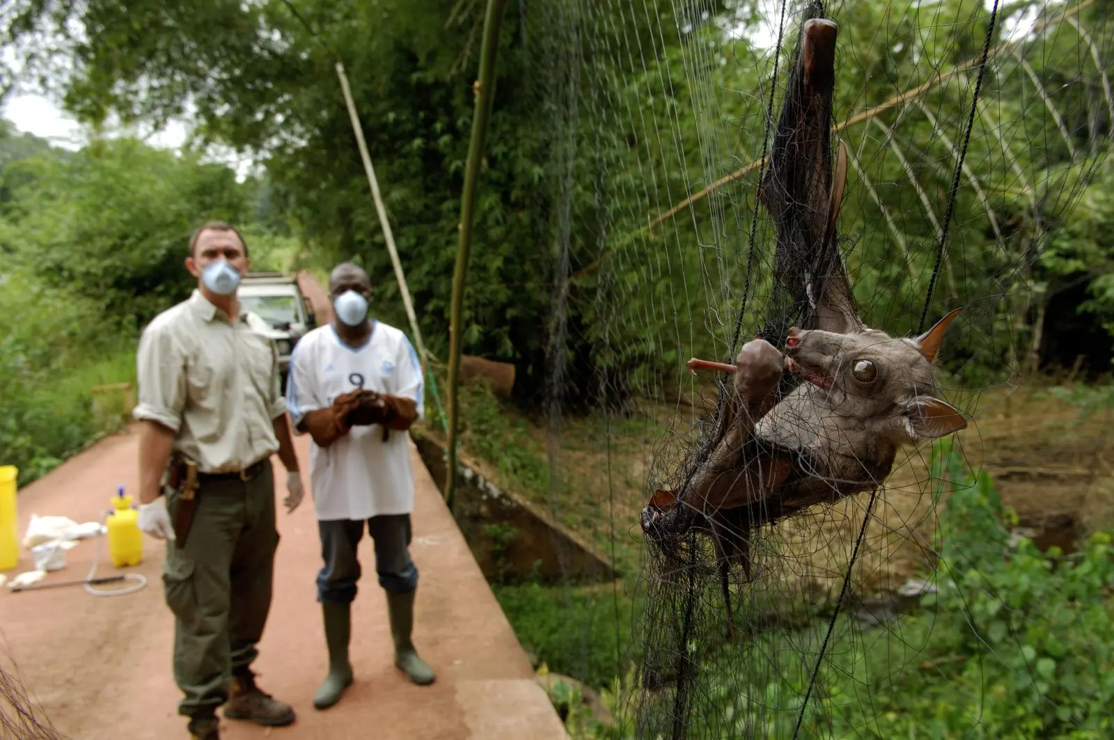 На фото: ГАБОН. ЗОНА ЭПИДЕМИИ. ЛЕТУЧИЕ МЫШИ, ПЕРЕНОСЯЩИЕ ЗАРАЗУ, ОТЛАВЛИВАЮТСЯ И ИССЛЕДУЮТСЯ