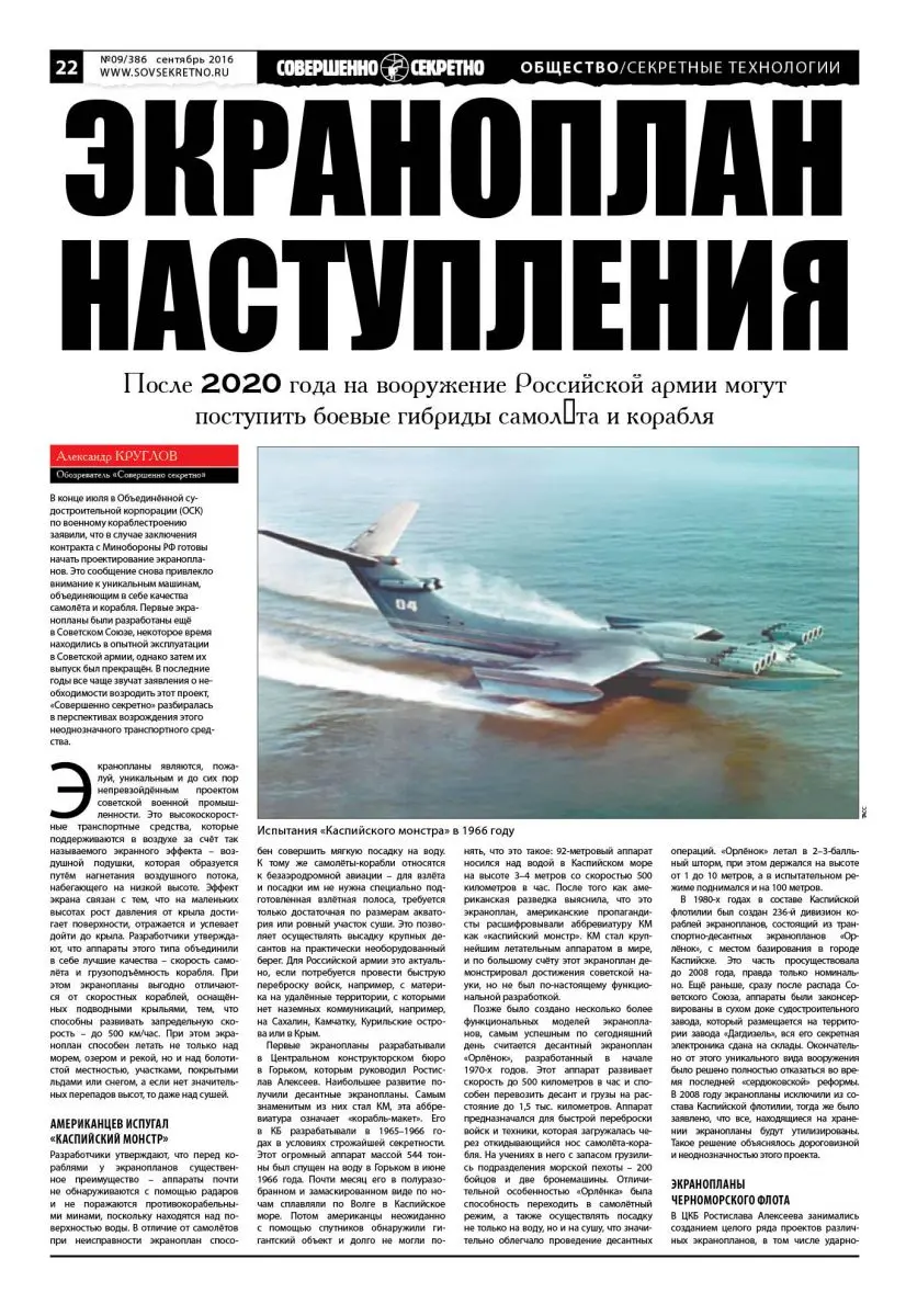 Первые экранопланы разрабатывали в Центральном конструкторском бюро в Горьком, которым руководил Ростислав Алексеев. Наибольшее развитие получили десантные экранопланы. Самым знаменитым из них стал КМ, эта аббревиатура означает «корабль-макет». Его в КБ разрабатывали в 1965–1966 годах в условиях строжайшей секретности. Этот огромный аппарат массой 544 тонны был спущен на воду в Горьком в июне 1966 года. Почти месяц его в полуразобранном и замаскированном виде по ночам сплавляли по Волге в Каспийское море. Потом американцы неожиданно с помощью спутников обнаружили гигантский объект и долго не могли понять, что это такое: 92-метровый аппарат носился над водой в Каспийском море на высоте 3–4 метров со скоростью 500 километров в час. После того как американская разведка выяснила, что это экраноплан, американские пропагандисты расшифровывали аббревиатуру КМ как «каспийский монстр». КМ стал крупнейшим летательным аппаратом в мире, и по большому счёту этот экраноплан демонстрировал достижения советской науки, но не был по-настоящему функциональной разработкой.