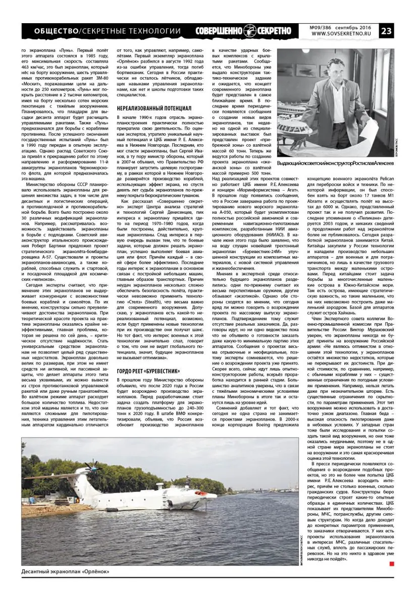 Как рассказал «Совершенно секретно» эксперт Центра анализа стратегий и технологий Сергей Денисенцев, пик интереса к экраноплану пришёлся где-то на период 1970–1980 годов, когда были построены, действительно, крупные экранопланы. Спад интереса в первую очередь вызван тем, что те боевые задачи, которые должен решать экраноплан, успешно выполняет боевая авиация или флот. Причём каждый – в своей сфере более эффективно. Последние годы интерес к экранопланам в основном связан с постройкой небольших машин, главным образом транспортных. Причин неудач экранопланов несколько: сложно обеспечить безопасность полёта, практически невозможно применить технологию «Стелз» (Stealth), что весьма важно для современного вооружения. Допускаю, у экранопланов есть какой-то нереализованный потенциал, возможно, если будут применены новые технологии при их производстве они получат шанс. Но тот факт, что интерес военных к этой технологии значительно спал, говорит о том, что они не видят глобального потенциала, значит, будущее экранопланов не вызывает оптимизма»
