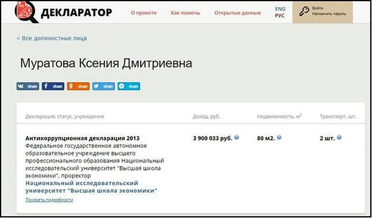 Открытые данные сервиса «Декларатор» показывают, что должность проректора НИУ ВШЭ позволила старшей дочери Муратова значительно увеличить свой доход. В 2013 году она заработала 4 миллиона рублей.