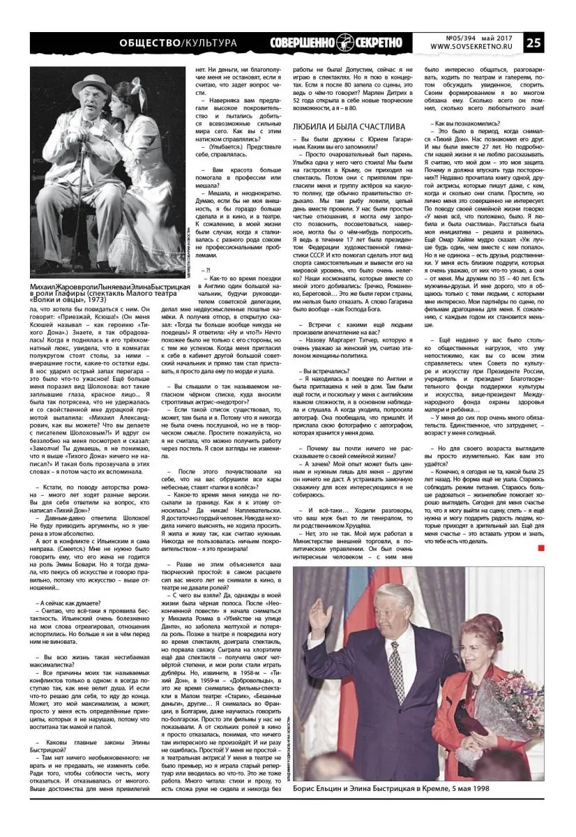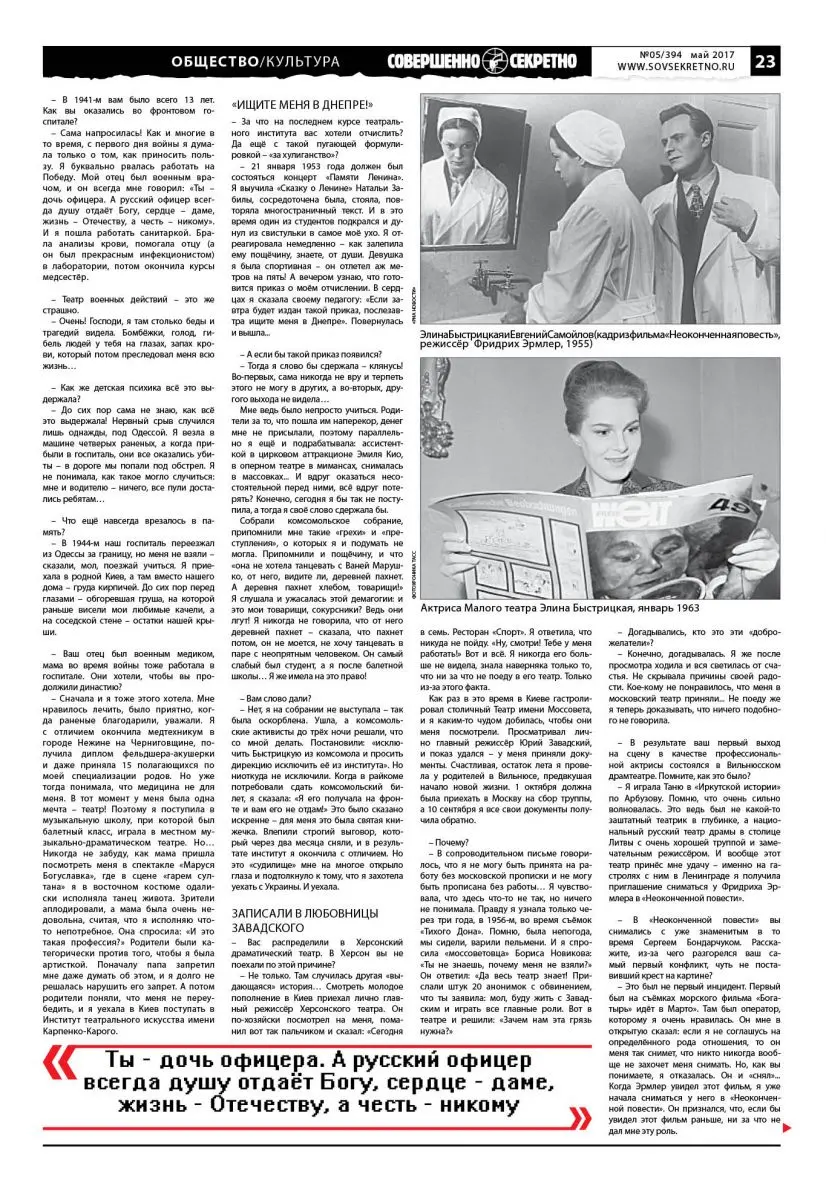 – Нет, я на собрании не выступала – так была оскорблена. Ушла, а комсомольские активисты до трёх ночи решали, что со мной делать. Постановили: «исключить Быстрицкую из комсомола и просить дирекцию исключить её из института». Но ниоткуда не исключили. Когда в райкоме потребовали сдать комсомольский билет, я сказала: «Я его получала на фронте и вам его не отдам!» Это было сказано искренне – для меня это была святая книжечка. Влепили строгий выговор, который через два месяца сняли, и в результате институт я окончила с отличием. Но это «судилище» мне на многое открыло глаза и подтолкнуло к тому, что я захотела уехать с Украины. И уехала.