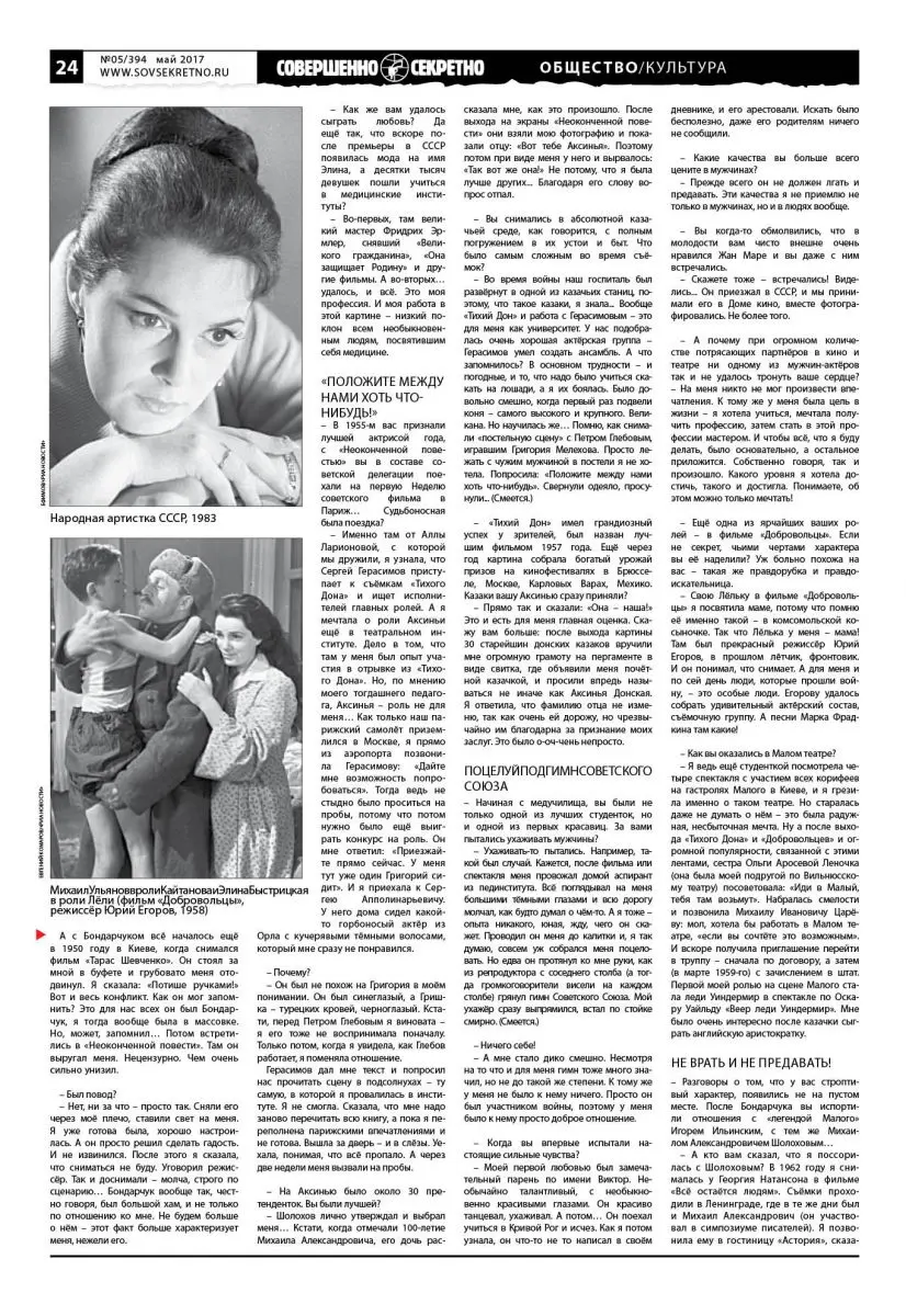– Он был не похож на Григория в моём понимании. Он был синеглазый, а Гришка – турецких кровей, черноглазый. Кстати, перед Петром Глебовым я виновата – я его тоже не воспринимала поначалу. Только потом, когда я увидела, как Глебов работает, я поменяла отношение.Герасимов дал мне текст и попросил нас прочитать сцену в подсолнухах – ту самую, в которой я провалилась в институте. Я не смогла. Сказала, что мне надо заново перечитать всю книгу, а пока я переполнена парижскими впечатлениями и не готова. Вышла за дверь – и в слёзы. Уехала, понимая, что всё пропало. А через две недели меня вызвали на пробы.