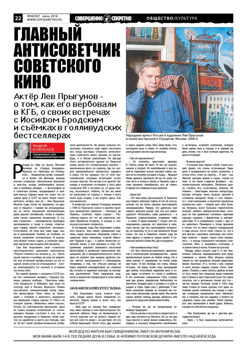 Ричард из «Иду на грозу», Виталий Бонивур из «Сердца Бонивура», Француз из «Трактира на Пятницкой»… Знаменитый актёр, снявшийся в более 100 фильмах, внешне вполне успешный, обласканный фортуной и властью, всегда улыбающийся красавчик и любимец женщин – с фотографий за 6 советских копеек, продающихся в каждом киоске. Однако мало кто знает, что на самом деле в СССР не было более «несоветского» актёра, чем он – Лев Прыгунов. Многие годы, почти не скрываясь, он дружил и общался с такими же вольнодумцами из числа творческой интеллигенции, даже выучил английский, чтобы в подлиннике читать запретную литературу. А «самое страшное» – периодически прилюдно высказывался в тонах и словах, «порочащих гордое звание советского человека». Естественно, об этом все, кому надо, знали и реагировали. Гнобить не гнобили, но жизнь отравляли основательно. В результате можно только гадать, в скольких хороших картинах ему не дали себя проявить.
