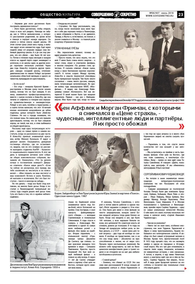 – Просто понял, что могу играть, что это моё. У меня было очень много энергии – я читал стихи, играл в спектаклях филфака, и многие говорили: «Ты должен стать артистом». Я сначала отвечал: «Какая сцена, когда у меня бентамские курочки королевские?!» А потом созрел. Между прочим, Алма-Ата в смысле творческой атмосферы была прекрасным городом. Там было много сосланных – очень много русских, немцев, жила потрясающая интеллигенция. Во время войны туда эвакуировали МХАТ, «Мосфильм»… Я видел, как Александр Файнциммер снимал «Котовского». Вот как интересно! В моей жизни было три мощные параллели. Первая – как раз с Файнциммером. Мне было года три, когда на моих глазах по Берёзовой аллее (знаменитое место под Алма-Атой) нёсся Котовский на тройке. Став постарше, я знал наизусть файнциммеровского «Овода» – с молодым Стриженовым и гениальным Симоновым. А годы спустя я снимусь у Александра Михайловича в одной из самых моих любимых ролей – в фильме «Без права на ошибку». Вторая параллель – с итальянской лентой «Утраченные грёзы» Джузеппе Де Сантиса, где снялась самая красивая женщина того времени в мире – Сильвана Пампанини. Красоты просто безумной! Это был мой самый любимый фильм – я плакал на нём всегда. А через 11 лет Де Сантис утвердит меня в картину «Они шли на Восток», которая круто изменит мою жизнь.
