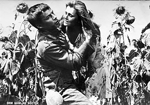 Лев Прыгунов в роли итальянца Баццоки и Жанна Прохоренко (Катя) в фильме Джузеппе Де Сантиса «Они шли на Восток». «Галатея» и «Мосфильм». 1964