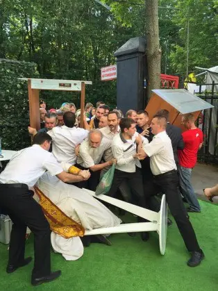 Председатель Патриаршей комиссии по вопросам семьи, защиты материнства и детства отец Дмитрий (Смирнов) решил лично разобраться с возмутителями тишины Петровского парка. Вместе с ним пошли клирики храма и немалая часть прихожан. На кадрах фото и видеосъемки, зафиксировавших дальнейшее, отчетливо видно, как толпа православных во главе с убеленным сединами протоиереем, одним своим напором прорывает явно опешивший от происходящего кордон охранников и опрокидывает рамки металлоискателей.