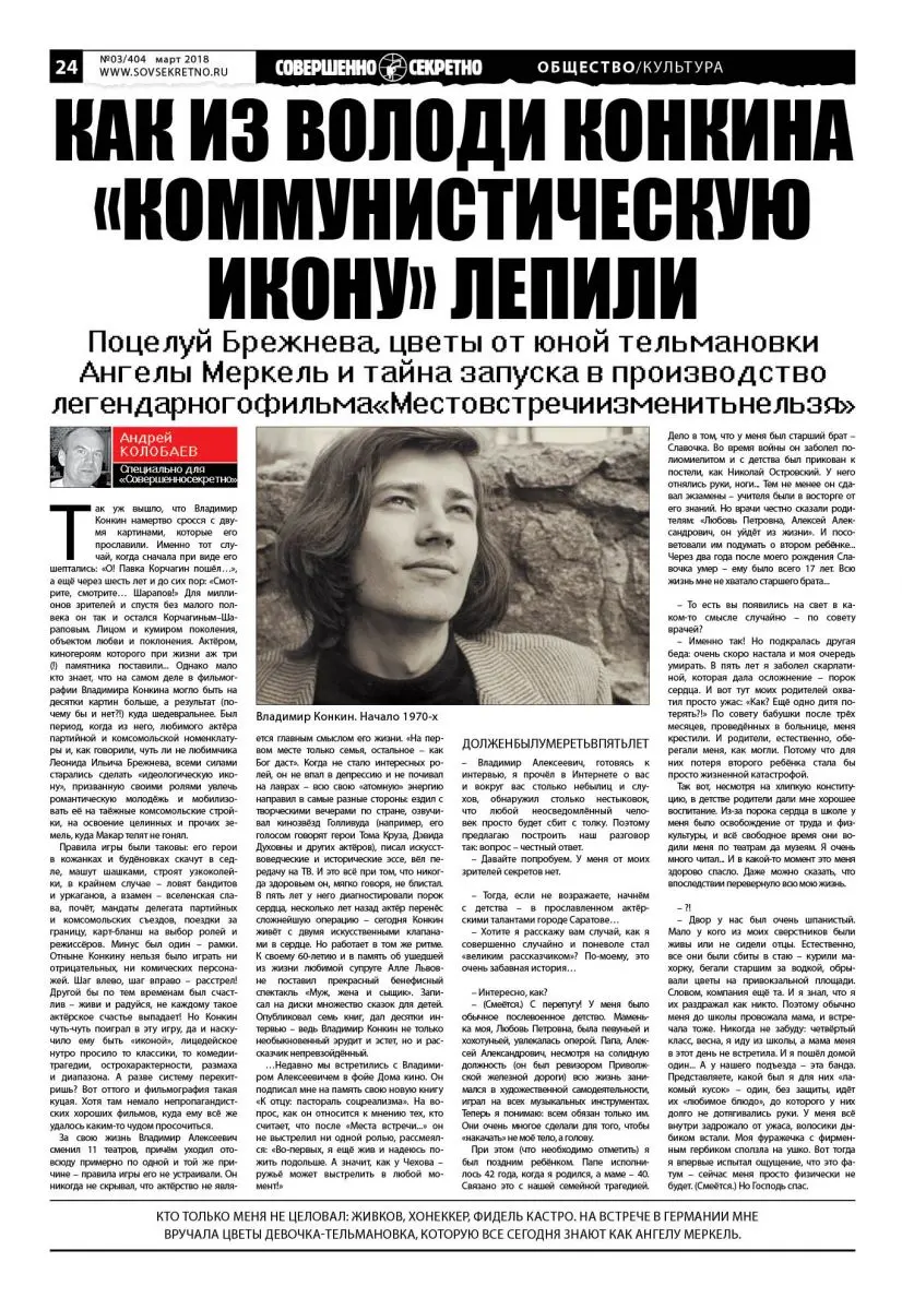 Так уж вышло, что Владимир Конкин намертво сросся с двумя картинами, которые его прославили. Именно тот случай, когда сначала при виде его шептались: «О! Павка Корчагин пошёл…», а ещё через шесть лет и до сих пор: «Смотрите, смотрите… Шарапов!» Для миллионов зрителей и спустя без малого полвека он так и остался Корчагиным–Шараповым. Лицом и кумиром поколения, объектом любви и поклонения. Актёром, киногероям которого при жизни аж три (!) памятника поставили… Однако мало кто знает, что на самом деле в фильмографии Владимира Конкина могло быть на десятки картин больше, а результат (почему бы и нет?!) куда шедевральнее. Был период, когда из него, любимого актёра партийной и комсомольской номенклатуры и, как говорили, чуть ли не любимчика Леонида Ильича Брежнева, всеми силами старались сделать «идеологическую икону», призванную своими ролями увлечь романтическую молодёжь и мобилизовать её на таёжные комсомольские стройки, на освоение целинных и прочих земель, куда Макар телят не гонял.