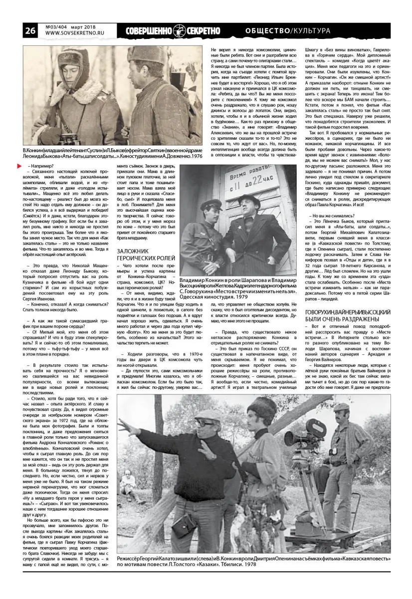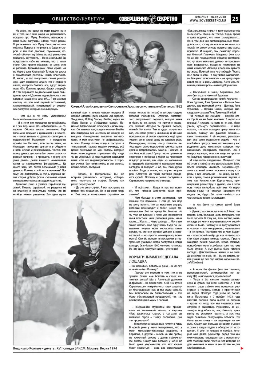 – Это был приказ по Госкино СССР, он существовал в напечатанном виде, от меня скрываемом. Я не понимал, что происходит: меня пробуют очень хорошие режиссёры на роли, противоположные Корчагину, – смешные, разные… Я вообще-то, если честно, комедийный артист! Я играл в театральном училище Шмагу в «Без вины виноватых», Гаврилова в «Горячем сердце». Мой дипломный спектакль – комедия «Когда цветёт акация». Меня мои педагоги на это и ориентировали. Они были изумлены, что Конкин – Корчагин. «Он же смешной артист!» А приказали наоборот: отныне Конкин не должен ни петь, ни танцевать, ни смешить с экрана! Теперь это икона! Тем более что вскоре мы БАМ начали строить… Кстати, потом я понял, что фильм «Как закалялась сталь» не просто так был снят. Это был спецзаказ. Наверху уже решили, что понадобятся строители узкоколеек. И такой фильм подоспел вовремя.