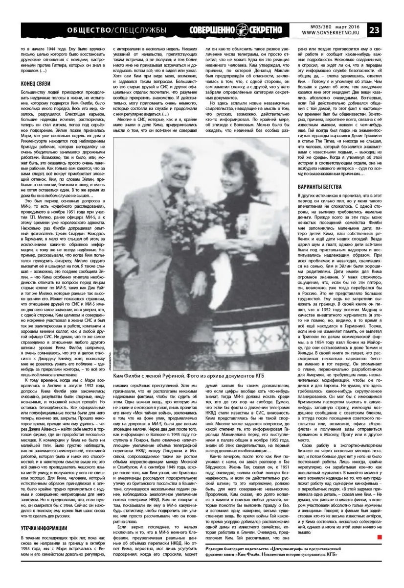 В течение последующих трёх лет, пока нас снова не направили за границу в октябре 1955 года, мы с Мэри встречались с Кимом и его семейством довольно регулярно, с интервалами в несколько недель. Никаких указаний от начальства, препятствующих таким встречам, я не получал; и тем более никто мне не приказывал встречаться и докладывать потом всё, что я видел или узнал. Хотя сам Ким при виде меня, возможно, и задавался таким вопросом. Большинство его старых друзей в СИС и других официальных отделах посчитали, что разумнее вообще прекратить знакомство. И действительно, могу припомнить очень немногих, которые состояли на службе и продолжали с ним регулярно видеться. (…)